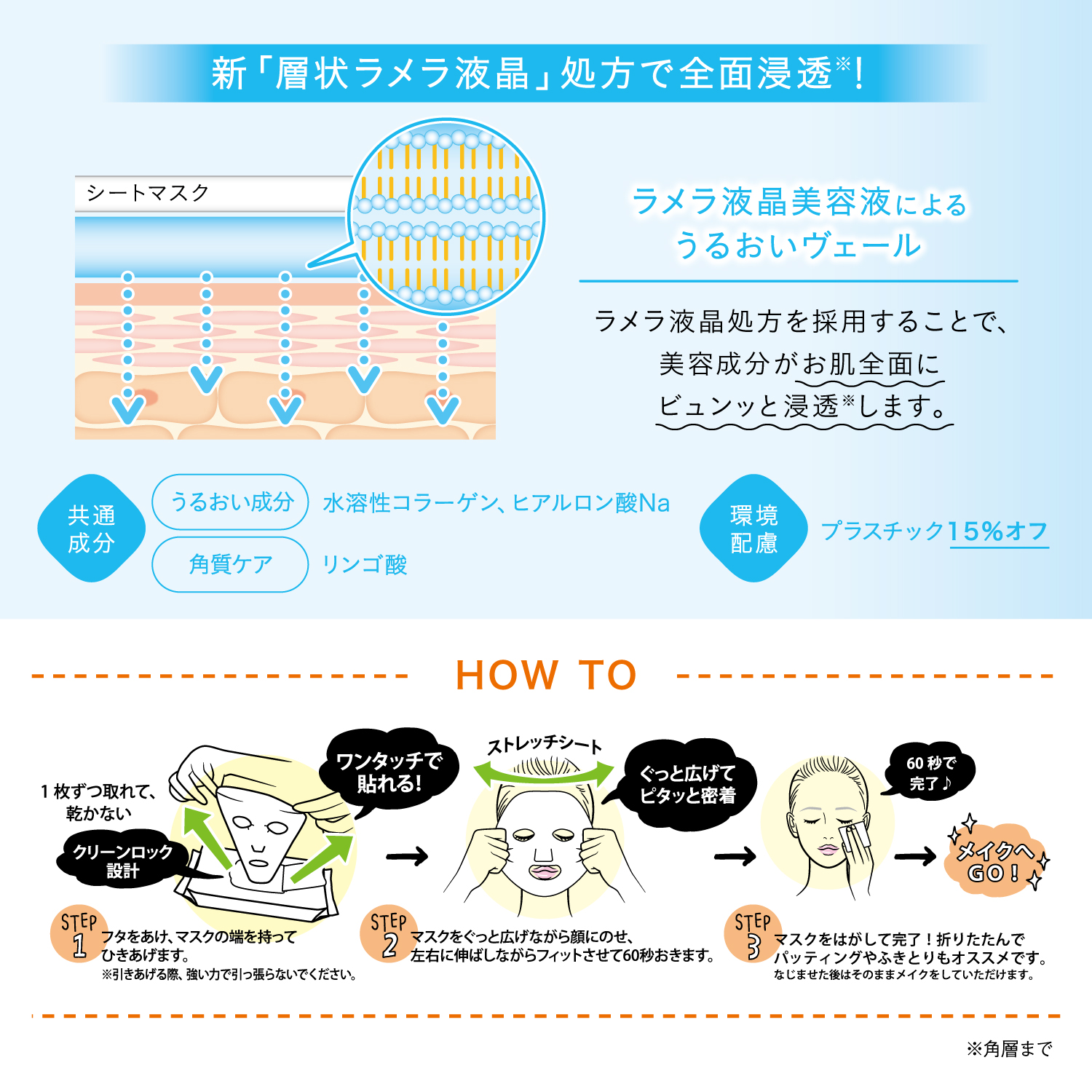 With a Layered Lamellar Liquid Crystal Formula, It Rapidly Penetrates the Skin! While lamellar structures are often spherical, this time we have adopted a layered lamellar liquid crystal formula. By using this in a sheet mask, beauty ingredients can be evenly and quickly absorbed into the skin without unevenness. Delivering deeper and faster, this sheet mask allows for thorough care in a simpler, more time-efficient way.