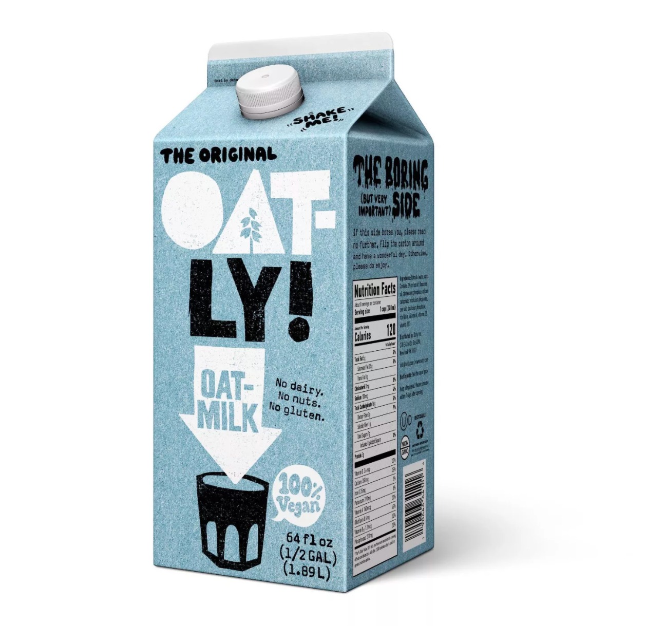 Creamy and delicious oat milk--we're not playing. It's oat of this world. No dairy, no soy, and no gluten. A silky mild oat milk with none of that weird thick texture. Look at that cute carton. You'll want to read it rather than scroll on your phone. In the best way possible, you'll find yourself saying, "What the oat is this?"