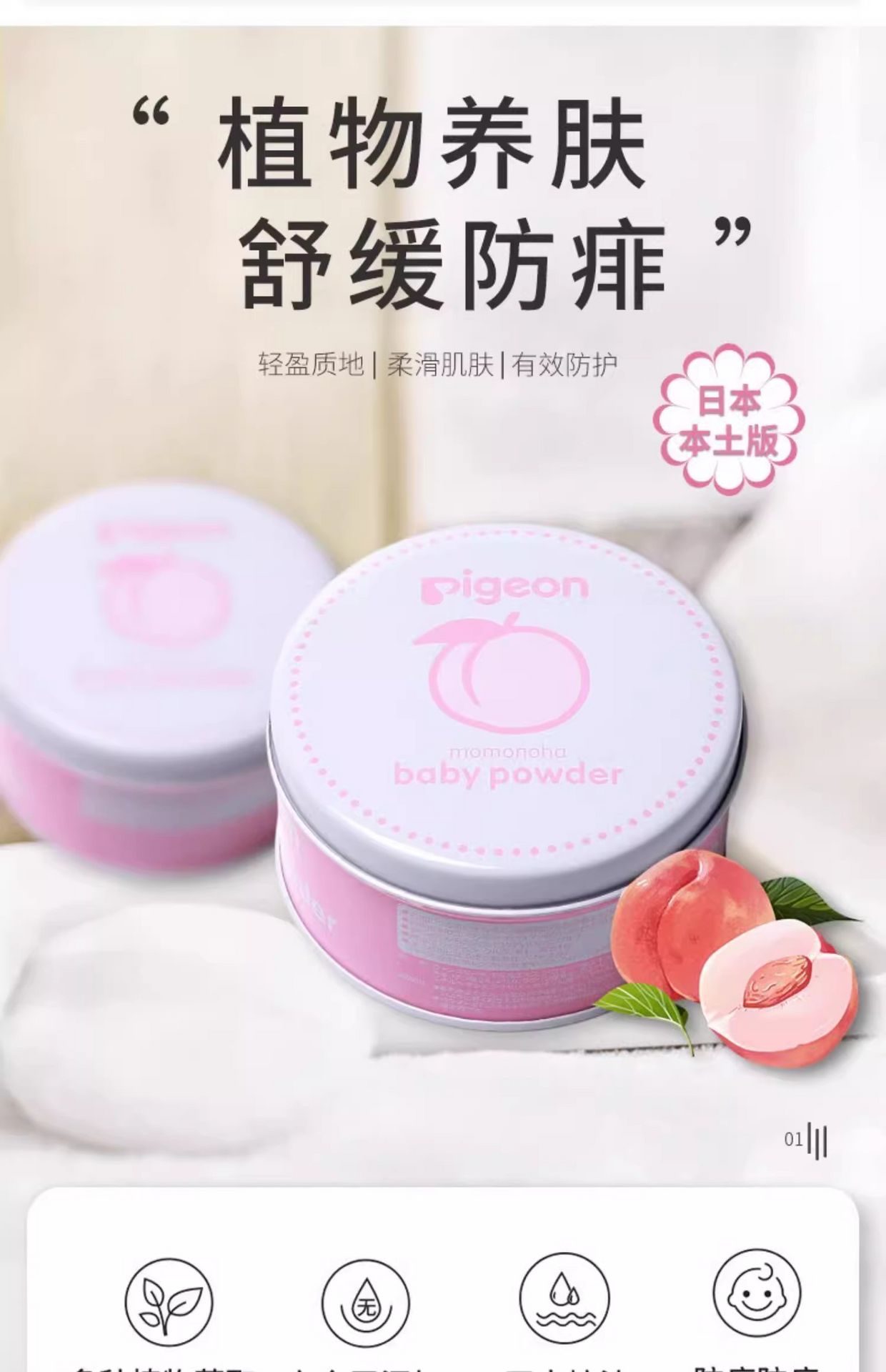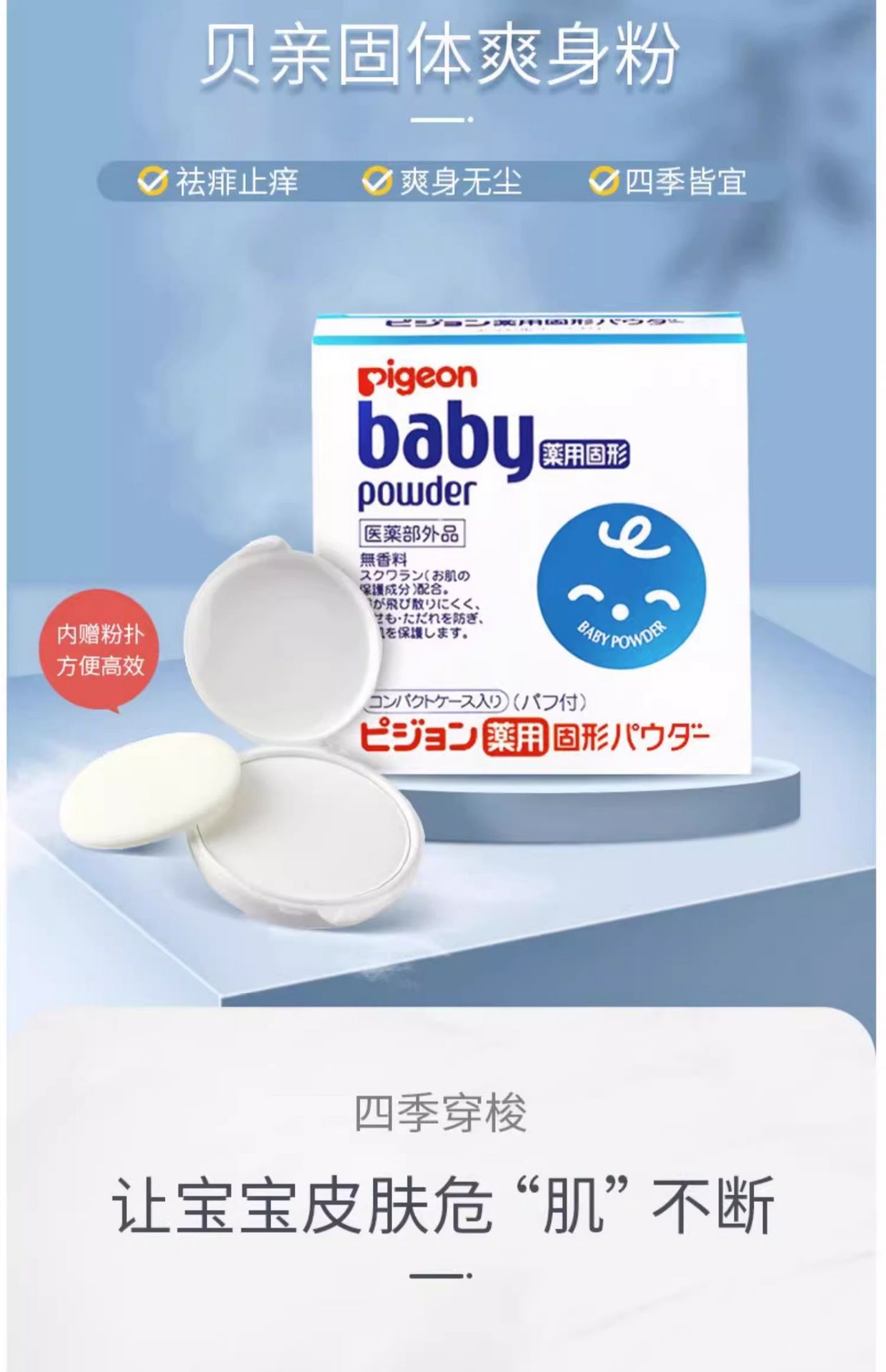 This baby powder from Pigeon is designed specifically for delicate infant skin. Its fine texture absorbs sweat and moisture effectively, helping prevent common skin issues such as heat rash and diaper rash. The fragrance-free formula minimizes irritation and keeps the baby's skin dry and comfortable. Ideal for use after bathing, during hot weather, or when changing diapers. A classic blue-can design and a reliable choice for daily baby care.