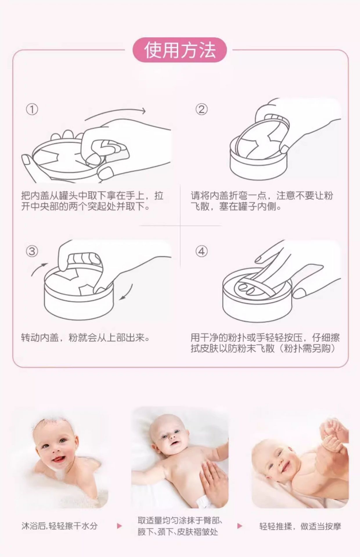 Avoid shaking the powder directly toward the baby’s face.