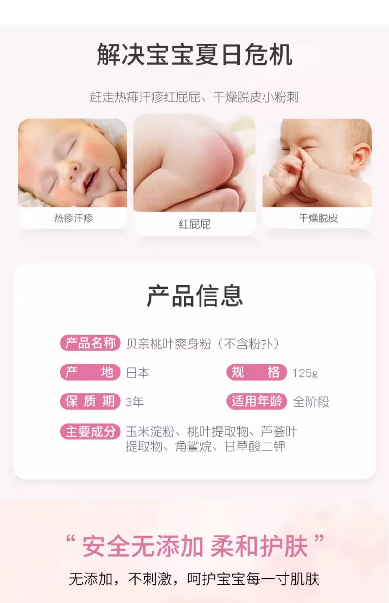 Contains zinc oxide to help prevent prickly heat, diaper rash, and irritation caused by friction.