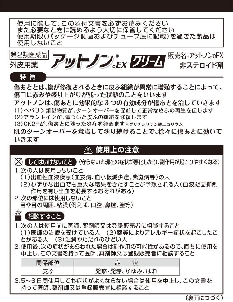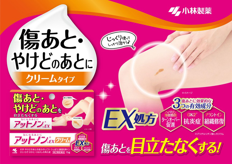 Scars are redness and swelling that remain at the site of a wound caused by abnormal proliferation of skin tissue when the wound is repaired. Attonon contains three active ingredients that are effective against scars and heal them.
