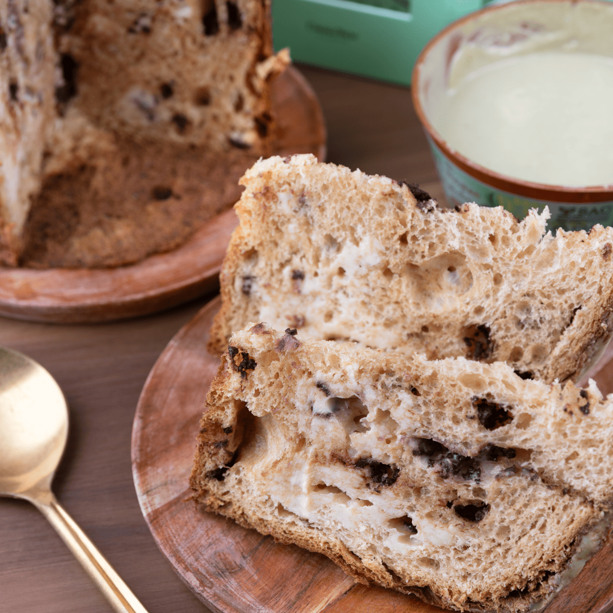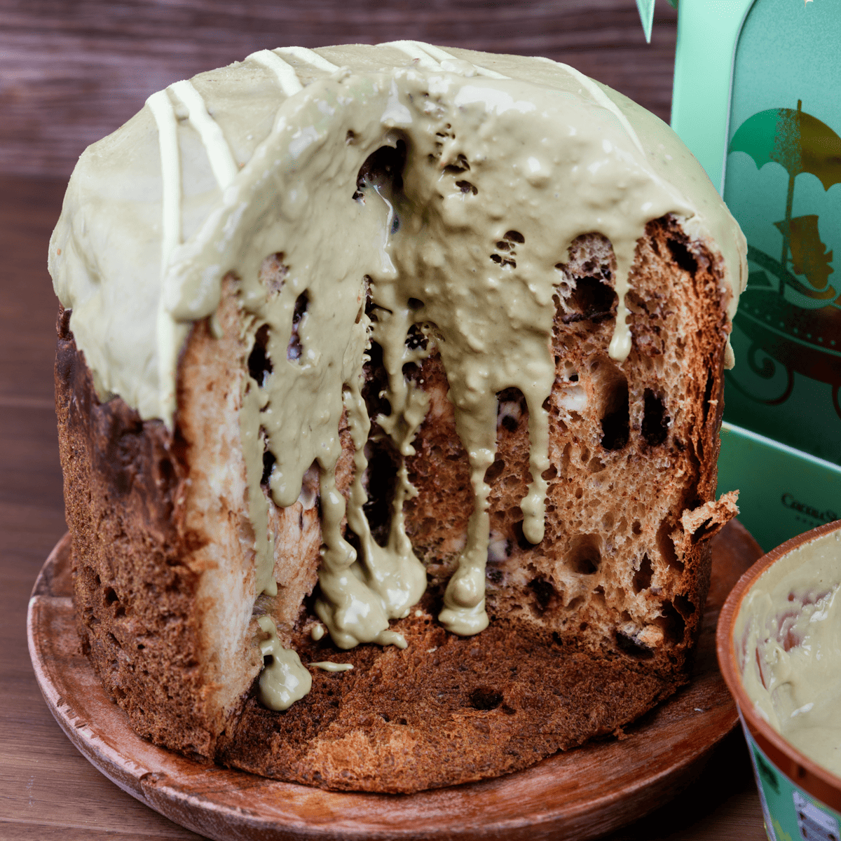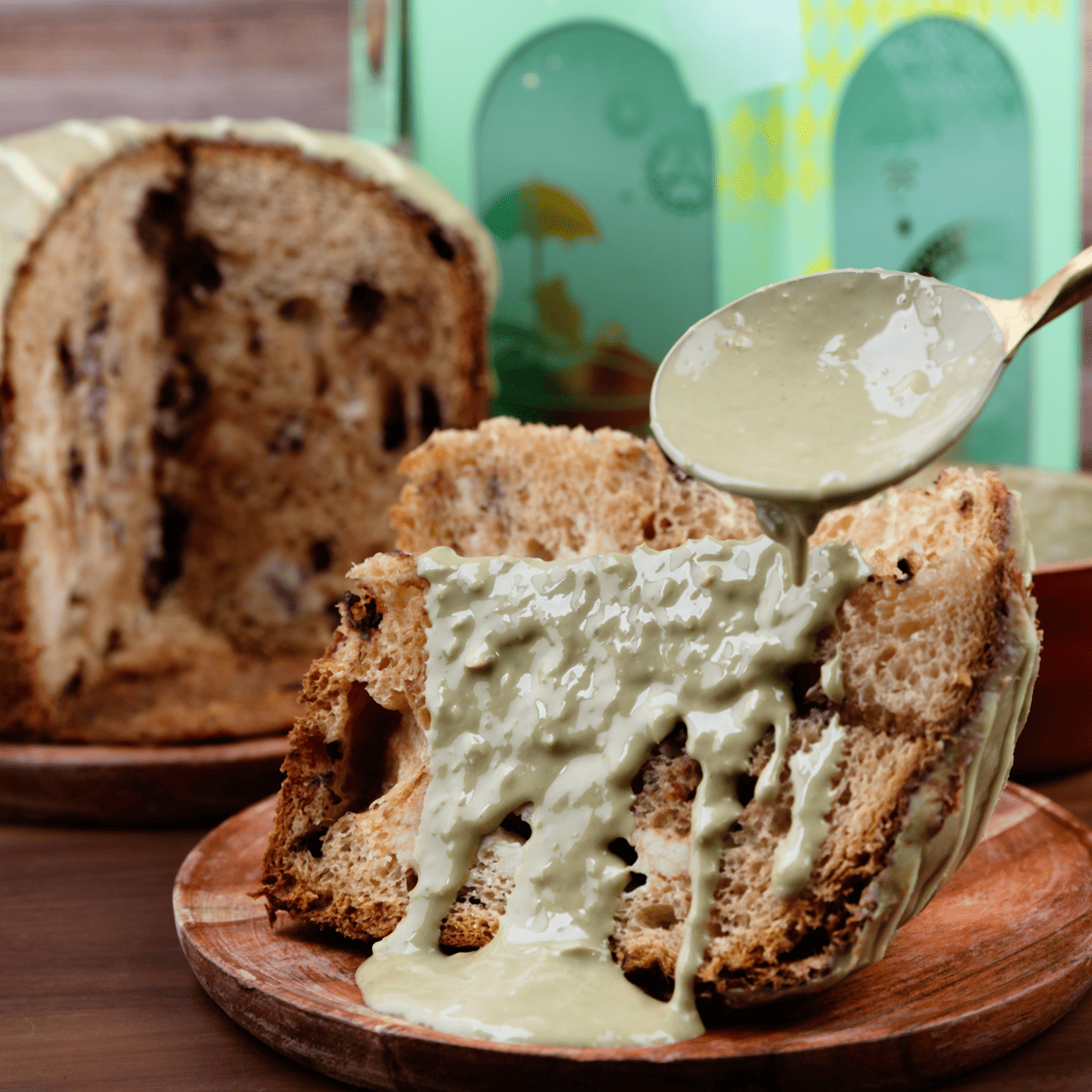 • Panetone com gotas de chocolate, recheio de trufa branca e cobertura de chocolate com pistache.