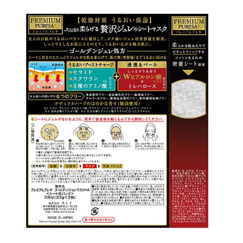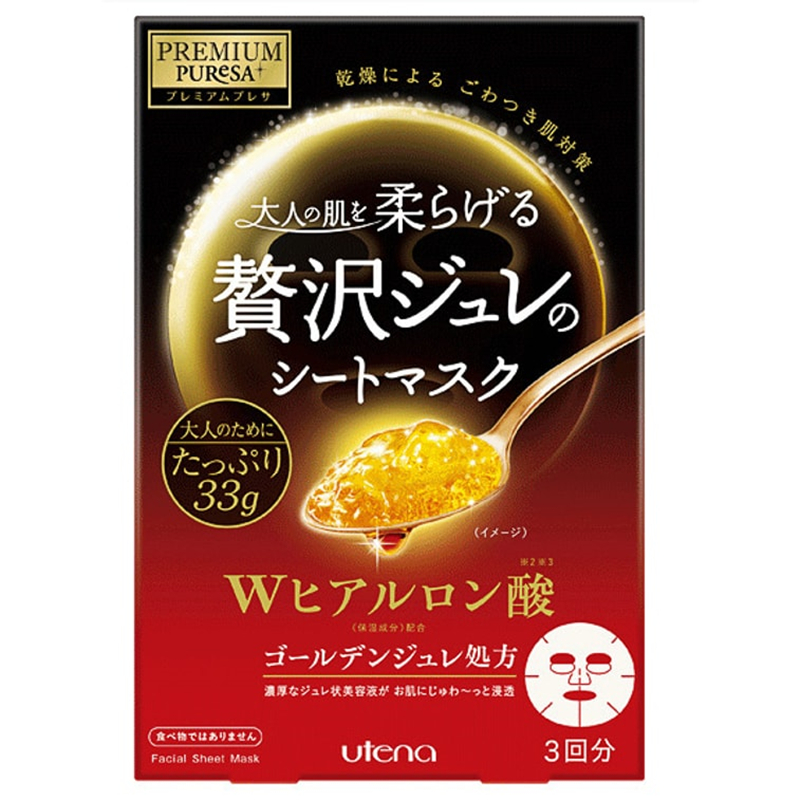UTENA Premium Presa Golden Gelée Mask is a high-quality beauty product that provides deep hydration to the skin. The mask contains hyaluronic acid, which is a powerful moisturizing agent that helps to keep the skin hydrated and plump. Brand: UTENA Origin: Japan Description: The UTENA Premium Presa Golden Gelée Mask is a luxurious face mask that is designed to provide deep hydration to the skin. The mask is made from a unique hydrogel material that adheres closely to the skin, allowing the active ingredients to penetrate deeply and effectively. Characteristics: The UTENA Premium Presa Golden Gelée Mask is enriched with a variety of natural ingredients, including hyaluronic acid, collagen, and royal jelly extract. These ingredients work together to deeply moisturize and nourish the skin, leaving it soft, smooth, and radiant. Usage methods: To use the UTENA Premium Presa Golden Gelée Mask, first cleanse and tone your skin. Then, remove the mask from its packaging and apply it to your face, making sure to smooth out any wrinkles or air bubbles. Leave the mask on for 10-15 minutes, then remove and discard. Gently pat any remaining essence into your skin until fully absorbed. Precautions: For external use only. Avoid contact with eyes. If contact occurs, rinse thoroughly with water. Discontinue use if irritation occurs. Keep out of reach of children. Store in a cool, dry place away from direct sunlight.